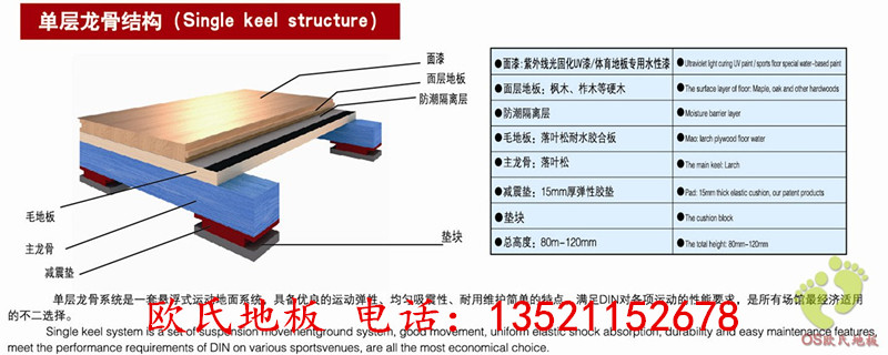 1、單層龍骨結構:此結構的體育木地板,結構簡單,安裝方便,成本相對較低。主要用于舞蹈室、舞臺、羽毛球室、乒乓球室。